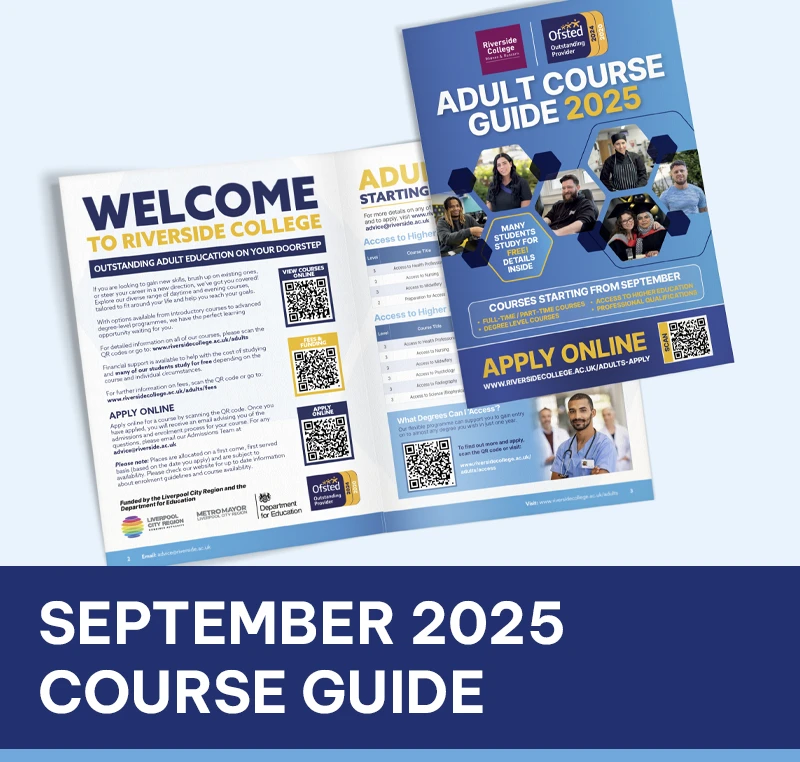 Tel: 0151 257 2053 or email advice@riversidecollege.ac.uk for more information on our Adult Courses.