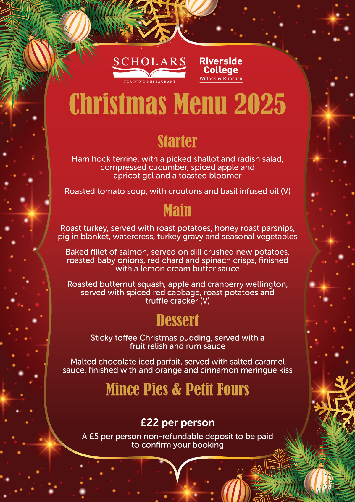 Booking is not always necessary, but to guarantee a table please call 0151 257 2015 or email scholars@riversidecollege.ac.uk